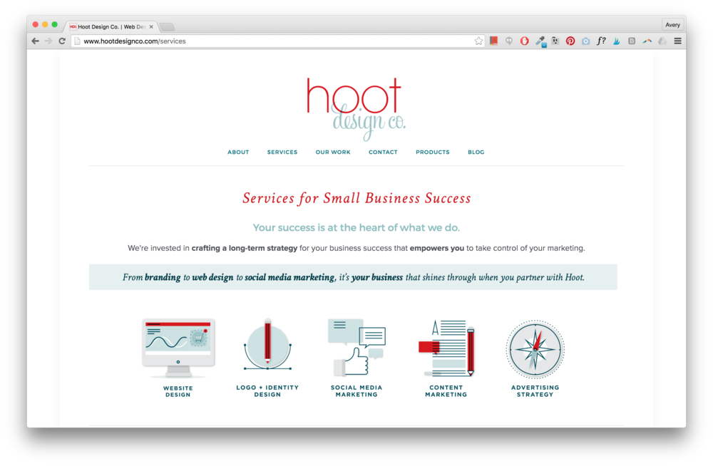 After five years in business, Hoot drastically changed course in 2015. The company moved away from the focus on printed products and events that had charted their path for years and instead began focusing on what they’d always done best: Marketing strategy for small businesses, built from the brand up.